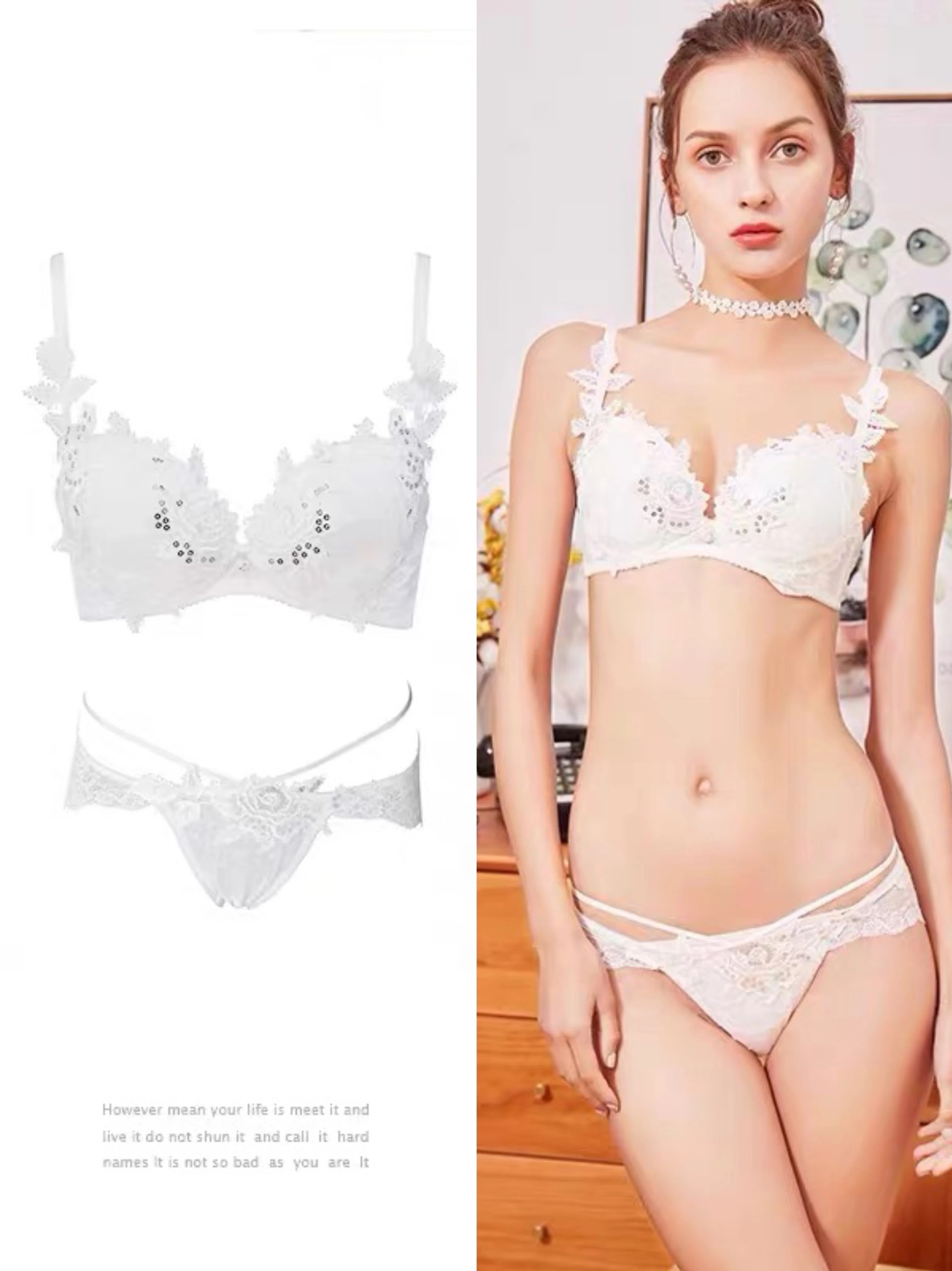 【海洋之心】蕾丝聚拢外扩白色纯欲内衣套装性感内搭带水钻链文胸