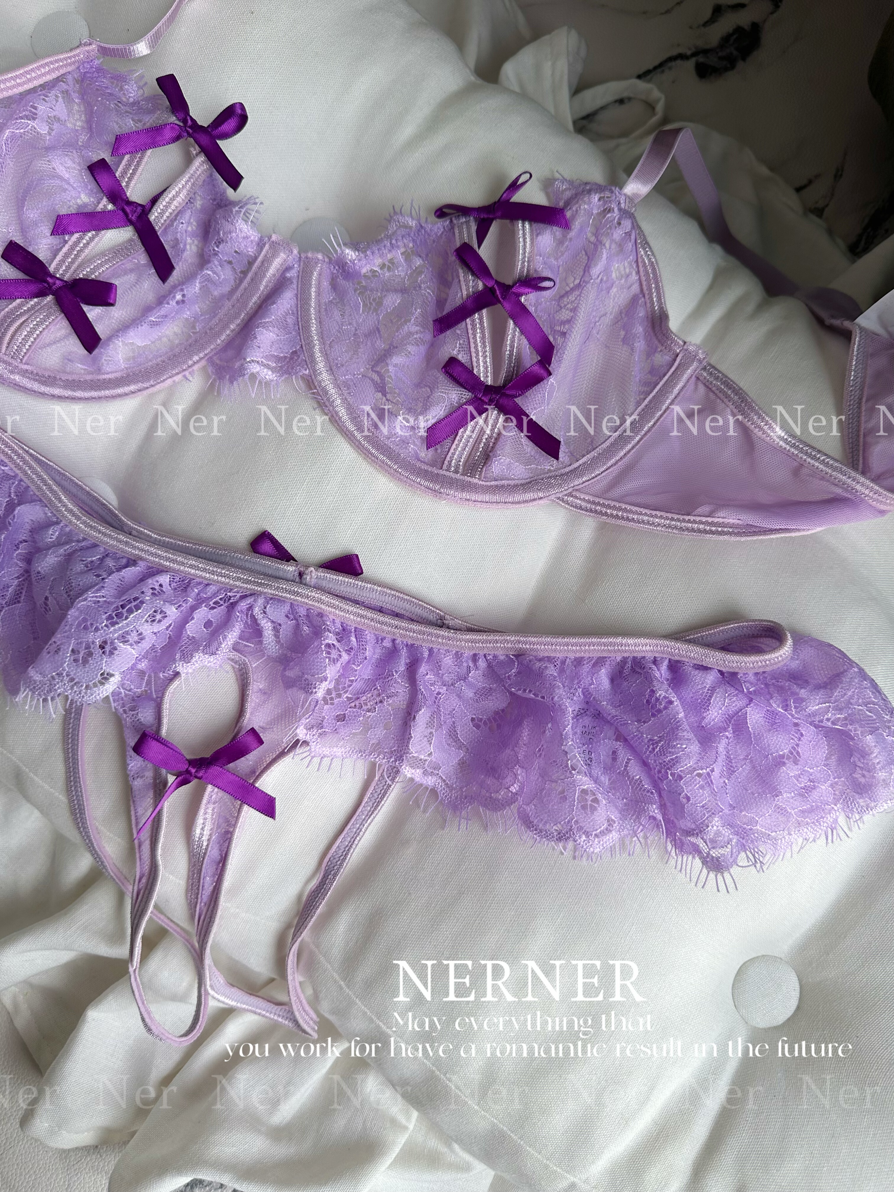 NERNER 紫艳*欧美蝴蝶结淡紫文胸上托聚拢内衣套装性感弹力包裹