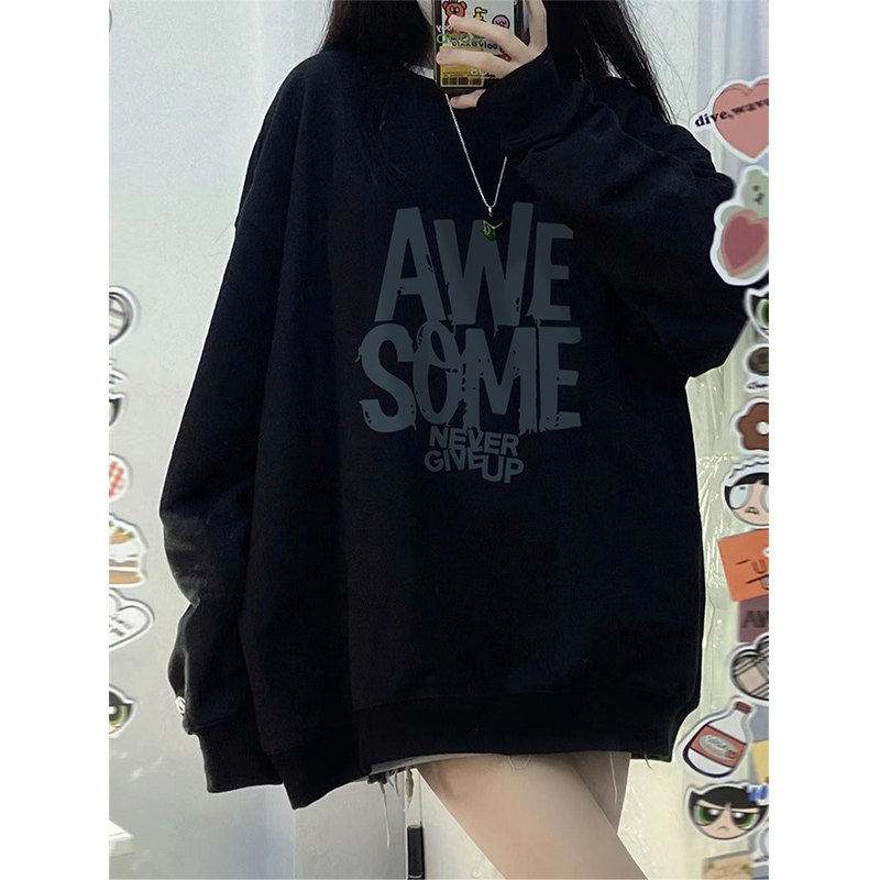 美式复古oversize卫衣女秋冬大码宽松加绒无帽黑色设计感显瘦上衣