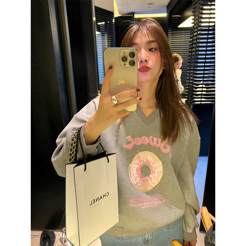 落落狷介 刺绣oversize卫衣女灰色套头V领上衣外套2023年早秋新款