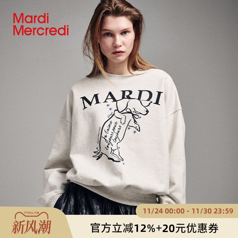 MardiMercredi摇尾珍珠小狗卫衣腊肠狗线条休闲宽松纯棉上衣新款