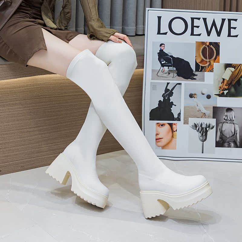 时尚过膝弹力长靴女2024新款厚底增高10CM粗跟瘦瘦靴白色粗腿靴子
