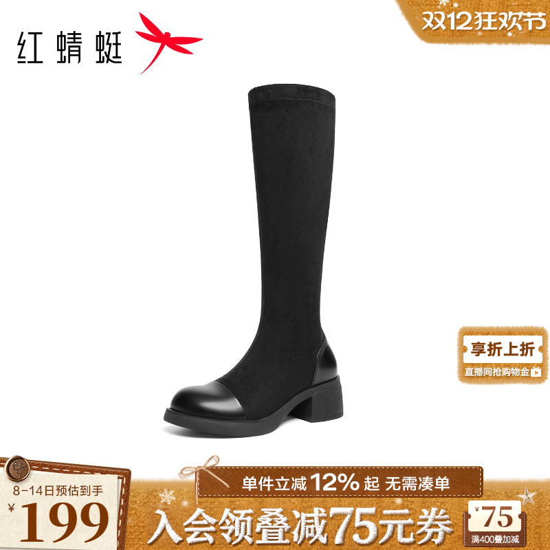 红蜻蜓弹力长靴女2025冬季新款女鞋靴子增高粗跟长筒靴黑色瘦瘦靴