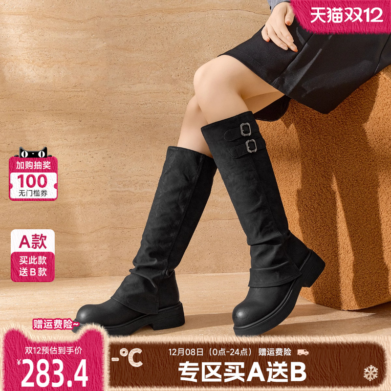 白鹿同款百丽小V靴弹力靴加绒冬季厚底骑士长筒靴女靴A1V1DDG3