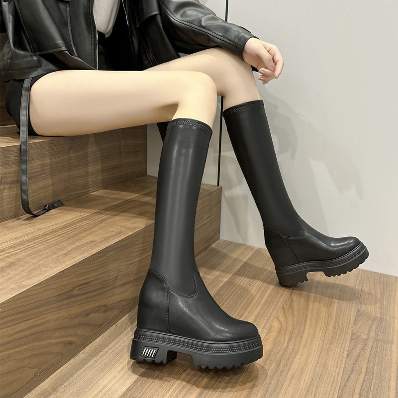 小个子弹力长靴女9cm内增高全牛真皮厚底休闲矮子乐高筒弹力靴潮