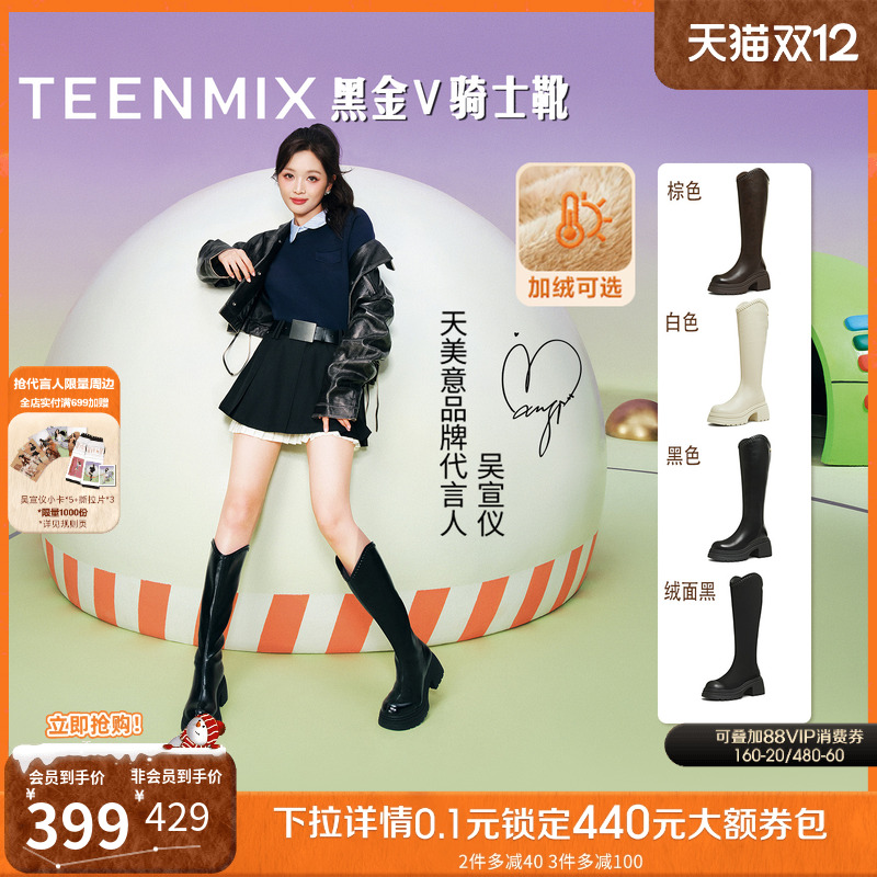 吴宣仪天美意厚底增高黑金V骑士靴加绒长靴女冬新款弹力靴时装靴