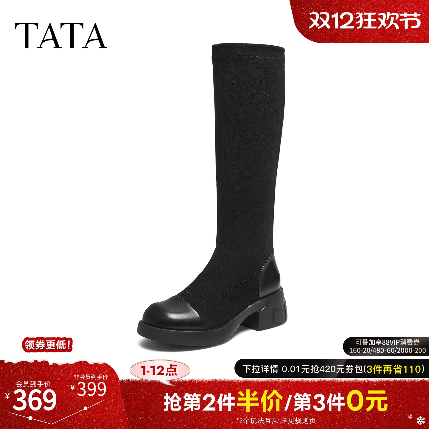 TATA他她弹力长靴女靴子长筒靴厚底粗跟黑色瘦瘦靴高筒靴CE601DG5