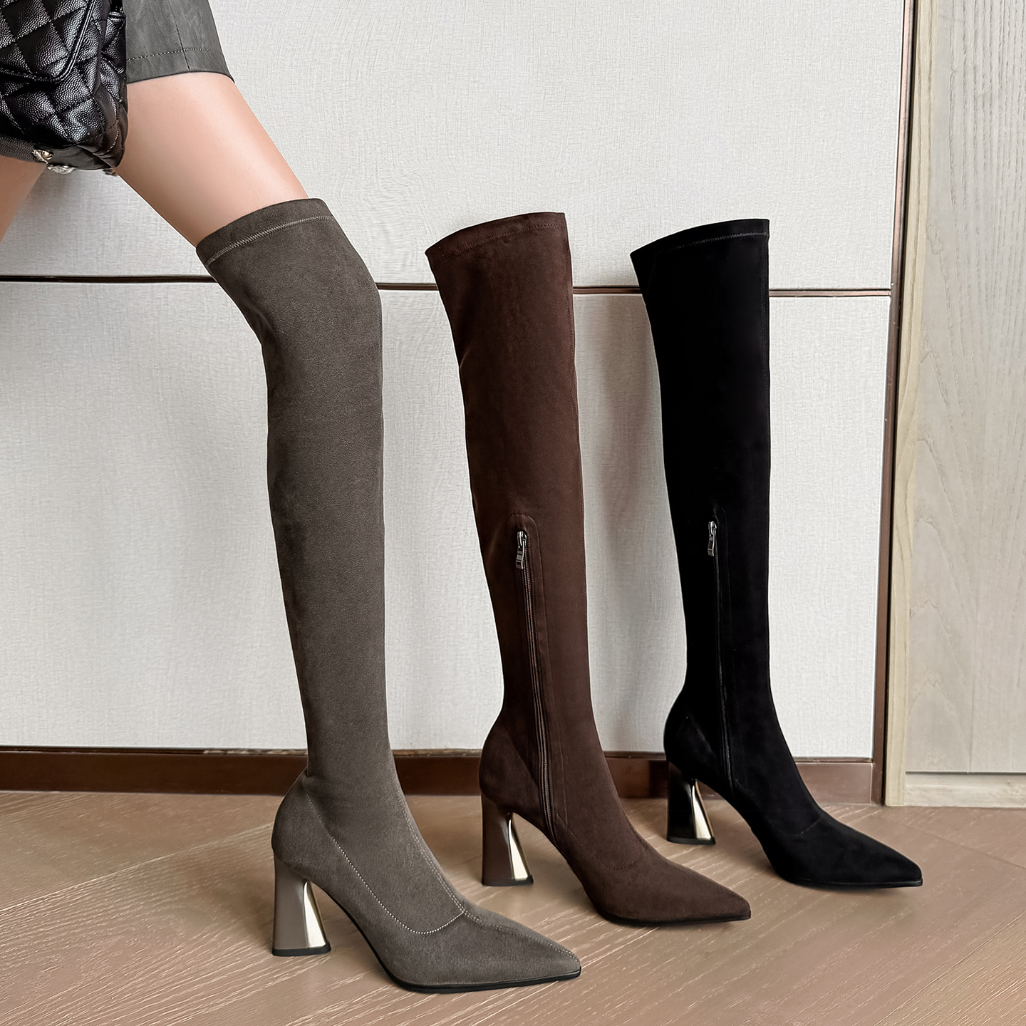 8cm包腿显瘦高跟弹力长靴女2025新款尖头高筒靴粗跟过膝瘦瘦靴子