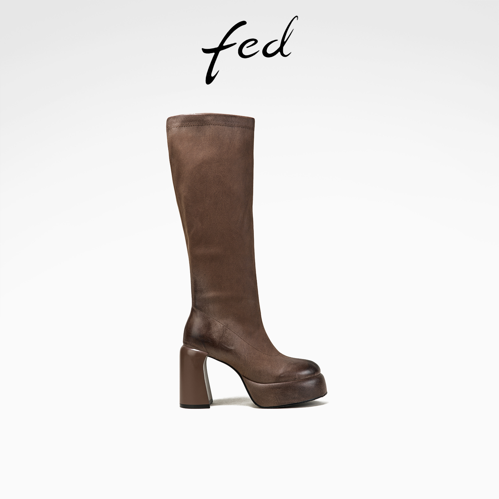 fed增高显瘦秋冬女鞋复古圆头粗高跟靴子女高筒骑士靴弹力长靴女