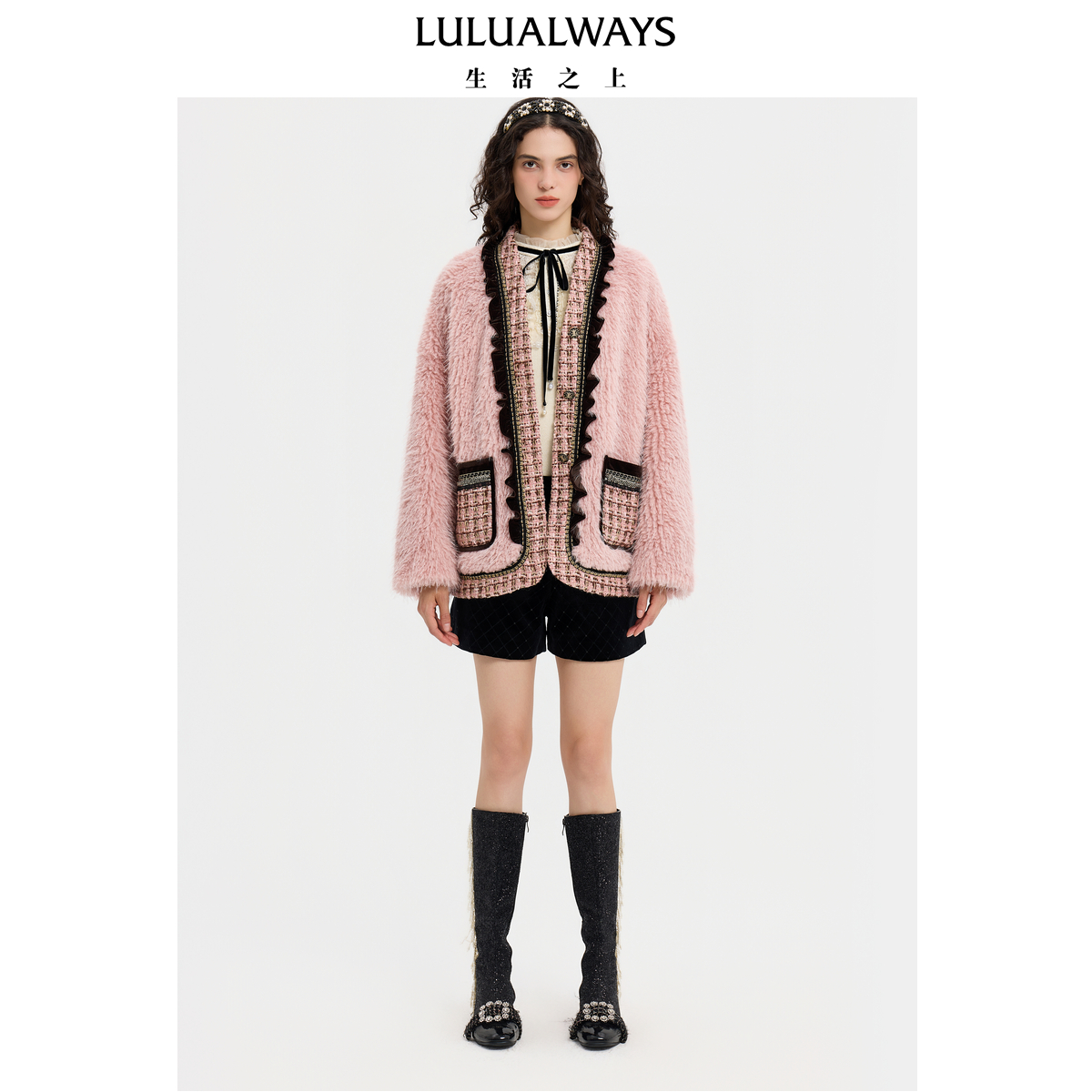 LULUALWAYS【商场同款】25冬季新款气质优雅粉色毛绒荷叶边外套女