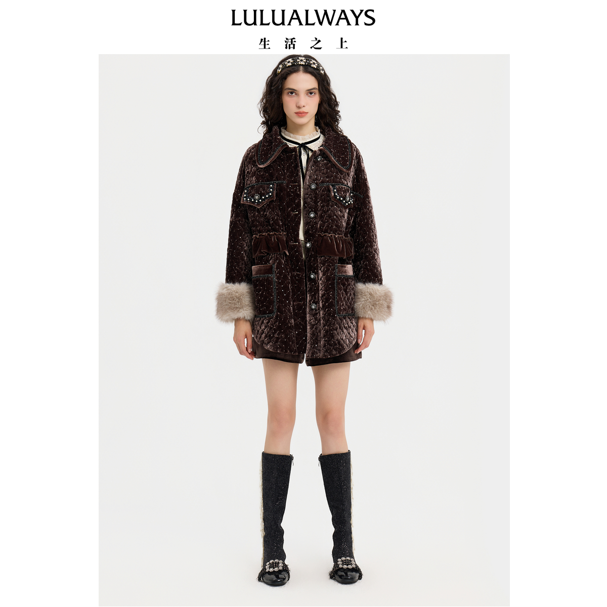 LULUALWAYS【商场同款】25冬季新款复古甜美娃娃领丝绒荷叶边外套