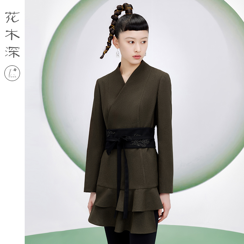 花木深荷叶边外套女中长款修身中国风女装不对称下摆腰带刺绣风衣