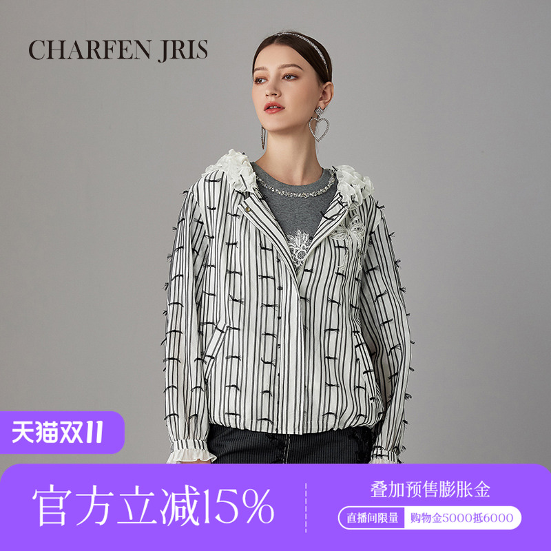 CHARFENJRIS朝峰2025春季新款时尚设计黑白条荷叶边外套