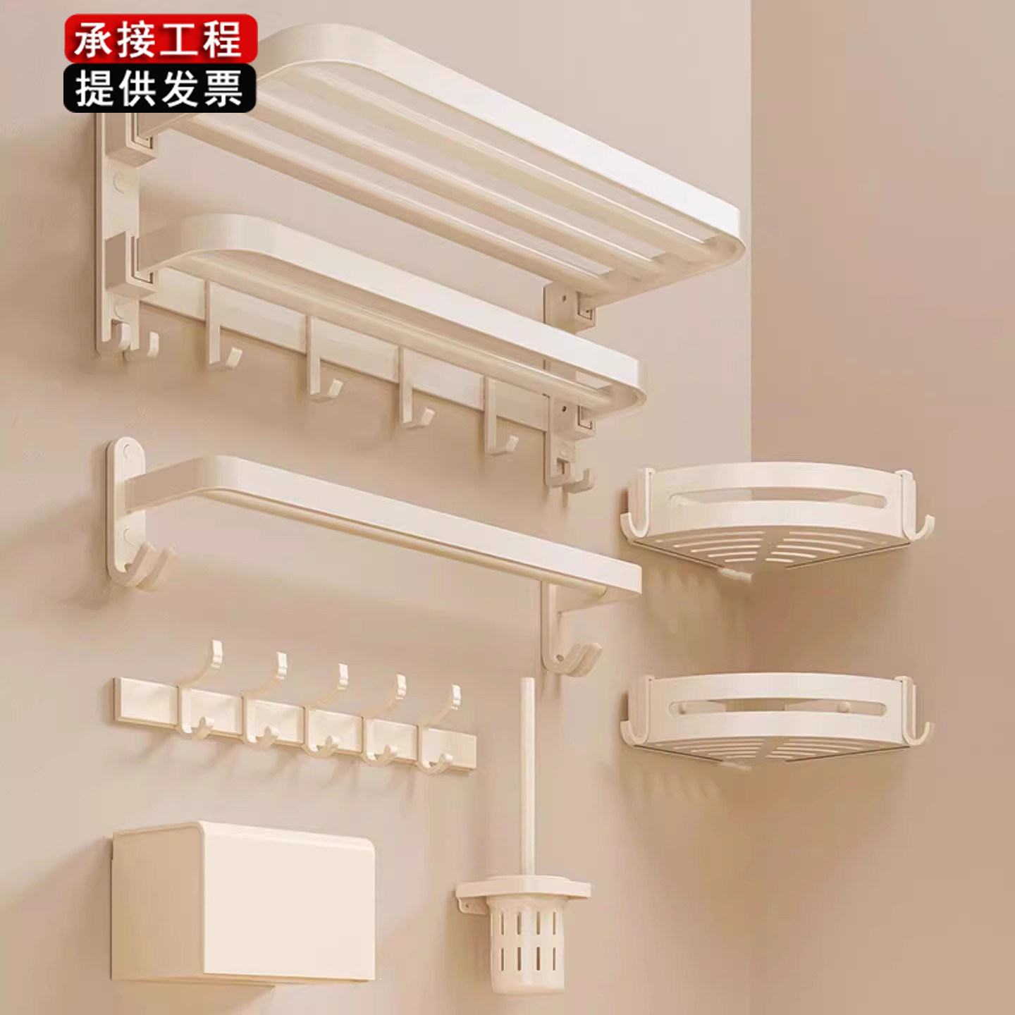 2VS奶油风免打孔毛巾架浴室IWN浴洗巾置件物架卫生间挂件五套装手
