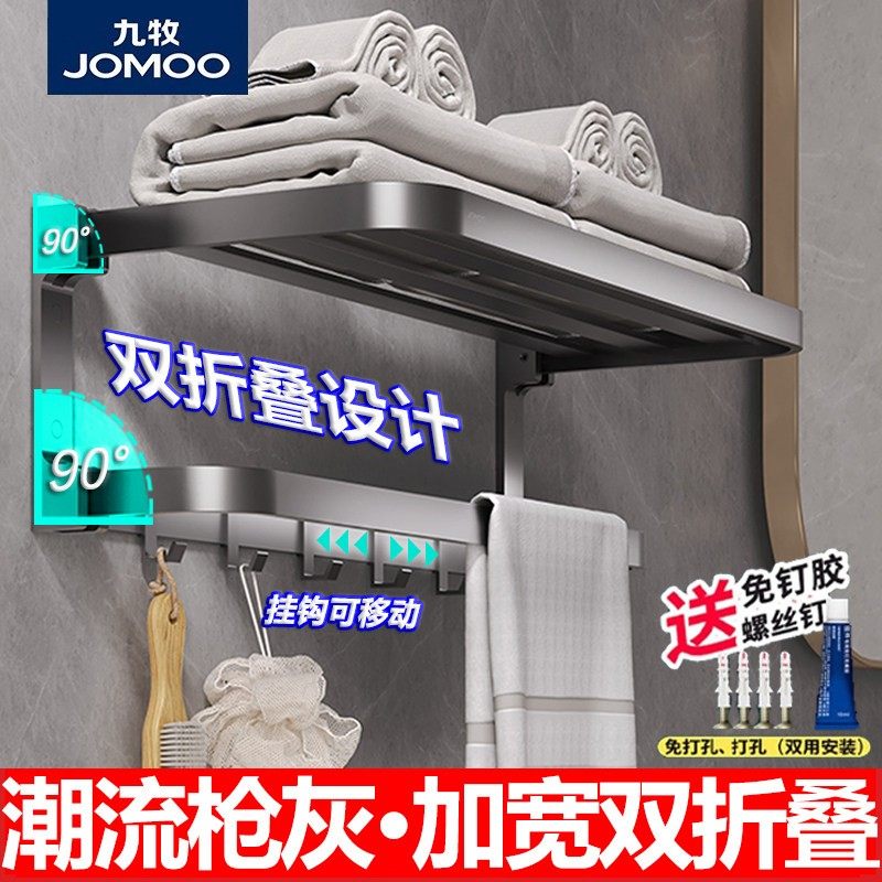 九牧浴室枪灰毛巾架置物架免打孔卫生间挂件厕所可折叠双层浴巾架