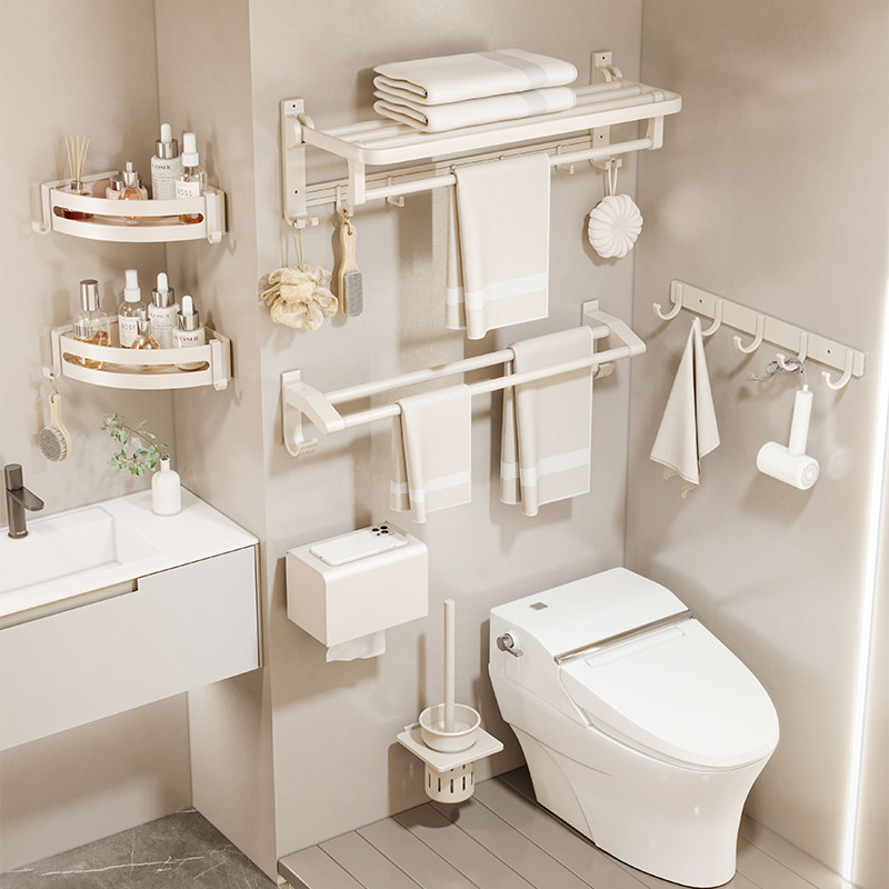 奶油风毛巾架免打孔白色太空铝浴室浴巾置物架子卫生间挂件套厕所