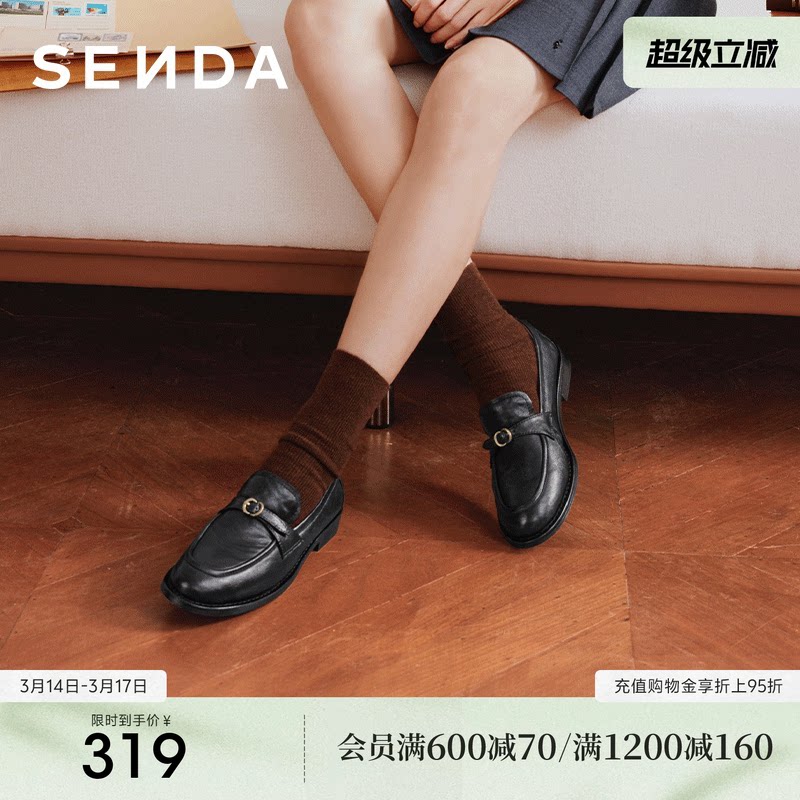森达羊皮乐福鞋女春新款英伦风真皮小皮鞋一脚蹬黑色平底单鞋女鞋