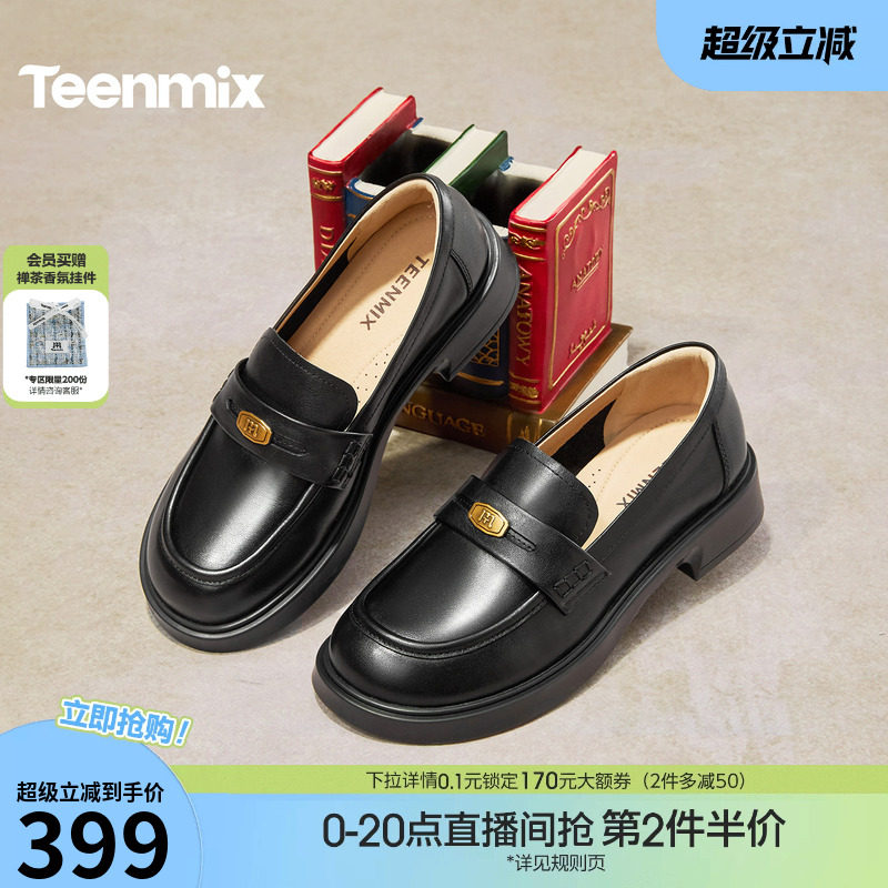 天美意英伦学院平底乐福鞋复古单鞋女一脚蹬软底小皮鞋2026春新款