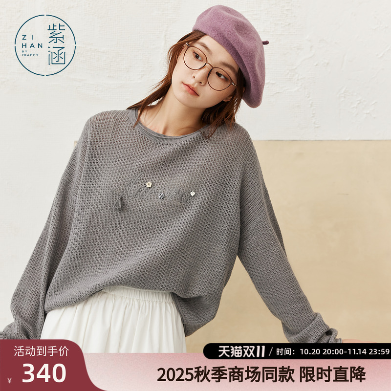 紫涵短款圆领刺绣毛衣女2025秋季新款慵懒宽松显瘦微透叠穿针织衫