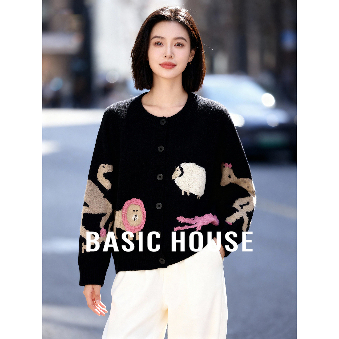 Basic House/百家好卡通刺绣毛衣女2025秋冬新款时尚休闲开衫外套