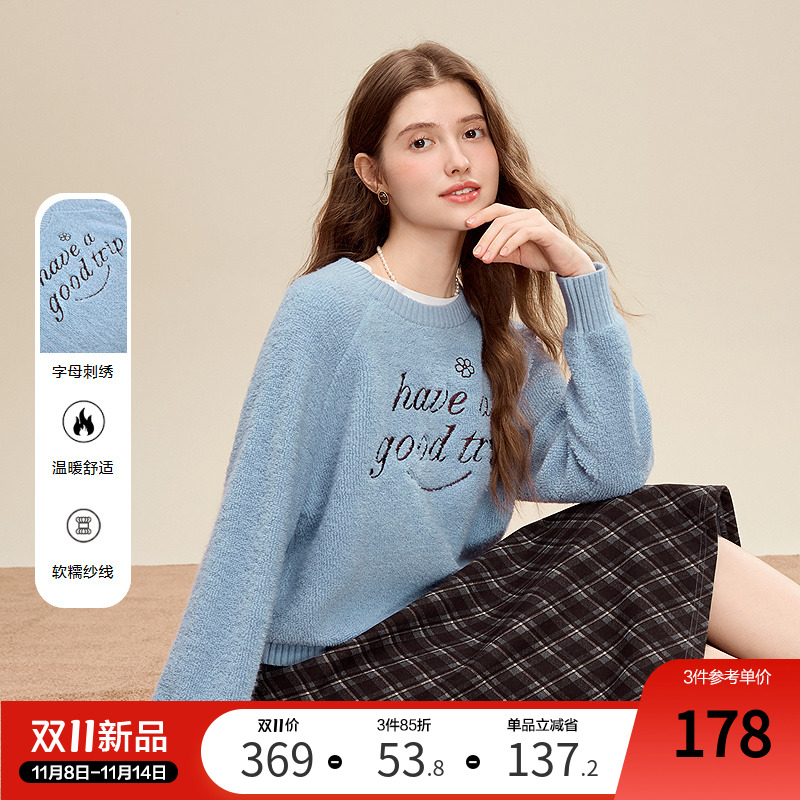 ablueberry 字母刺绣毛衣女秋冬毛绒绒软糯圆领宽松韩系甜美上衣