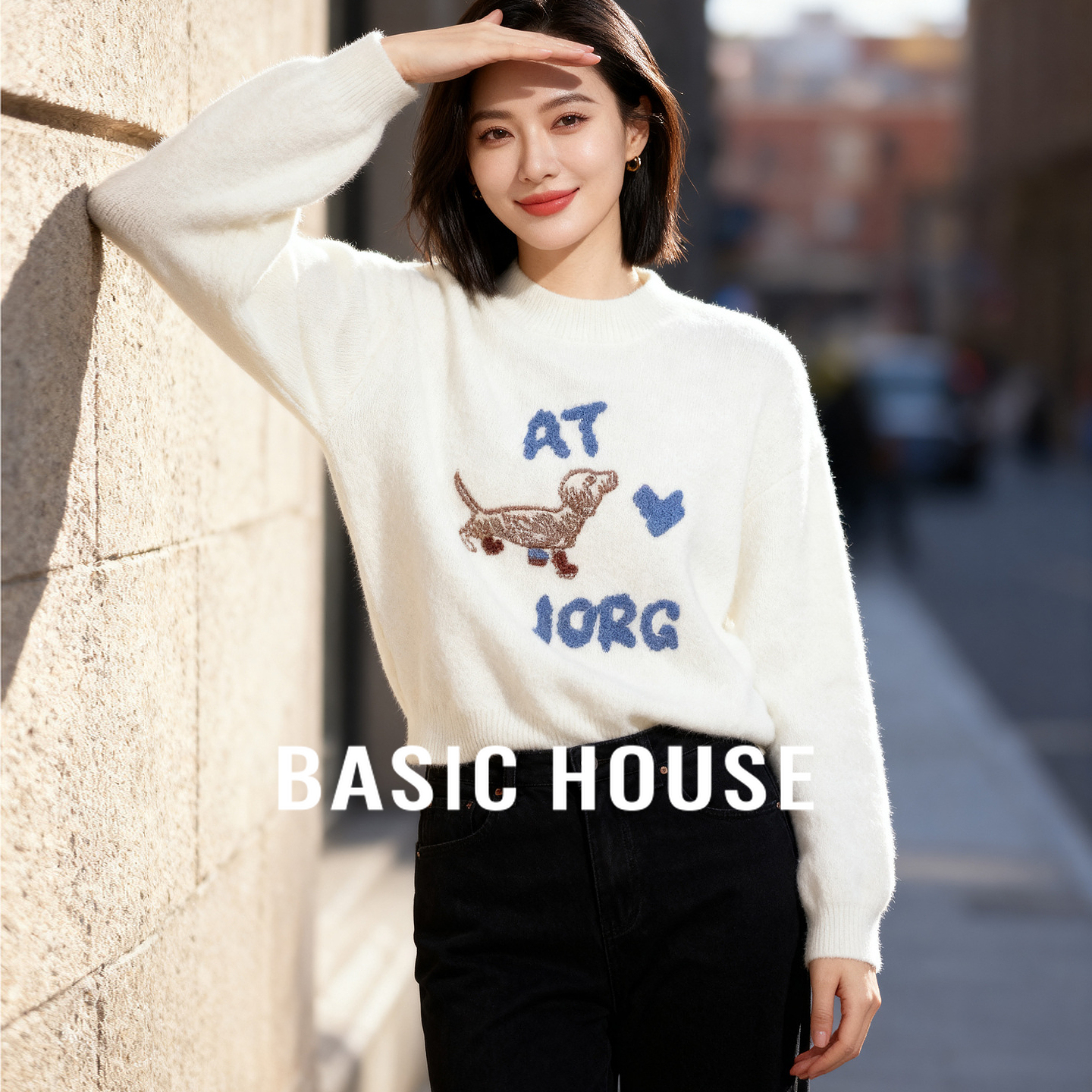 Basic House/百家好小狗字母刺绣毛衣女2025秋冬宽松圆领毛绒上衣