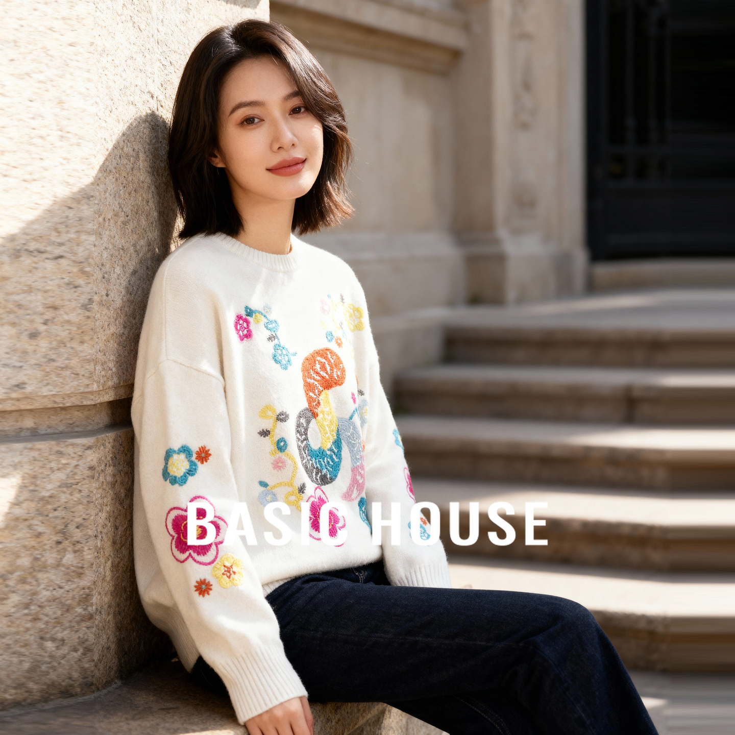Basic House/百家好卡通刺绣圆领毛衣插肩袖套头加厚针织上衣秋冬