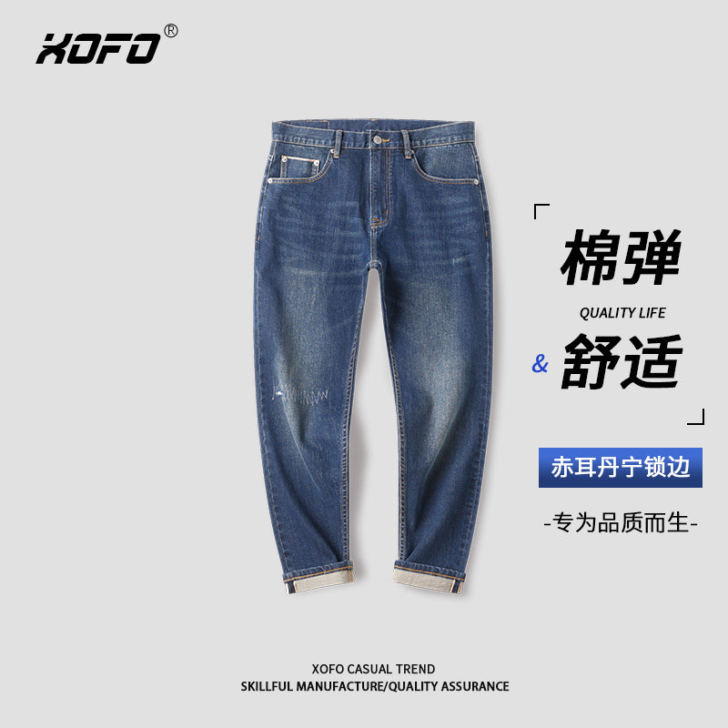 xofo新款复古水洗直筒宽松休闲小脚浅色九分赤耳牛仔裤子男冬季