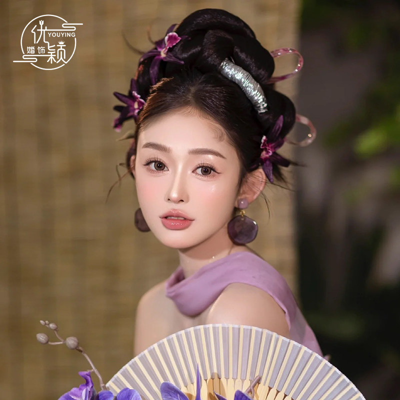 优颖新中式新娘头饰紫色石斛兰仿真花发簪古风旗袍晨袍汉服发饰品