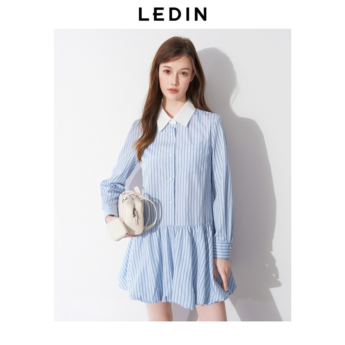 乐町撞色翻领甜美花苞连衣裙女25年春季新款硫酸铜蓝色长袖衬衫裙