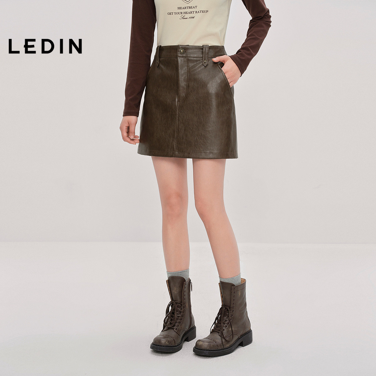 【商场同款】乐町基础分割仿皮裙冬季深棕A字裙C2GEE4204