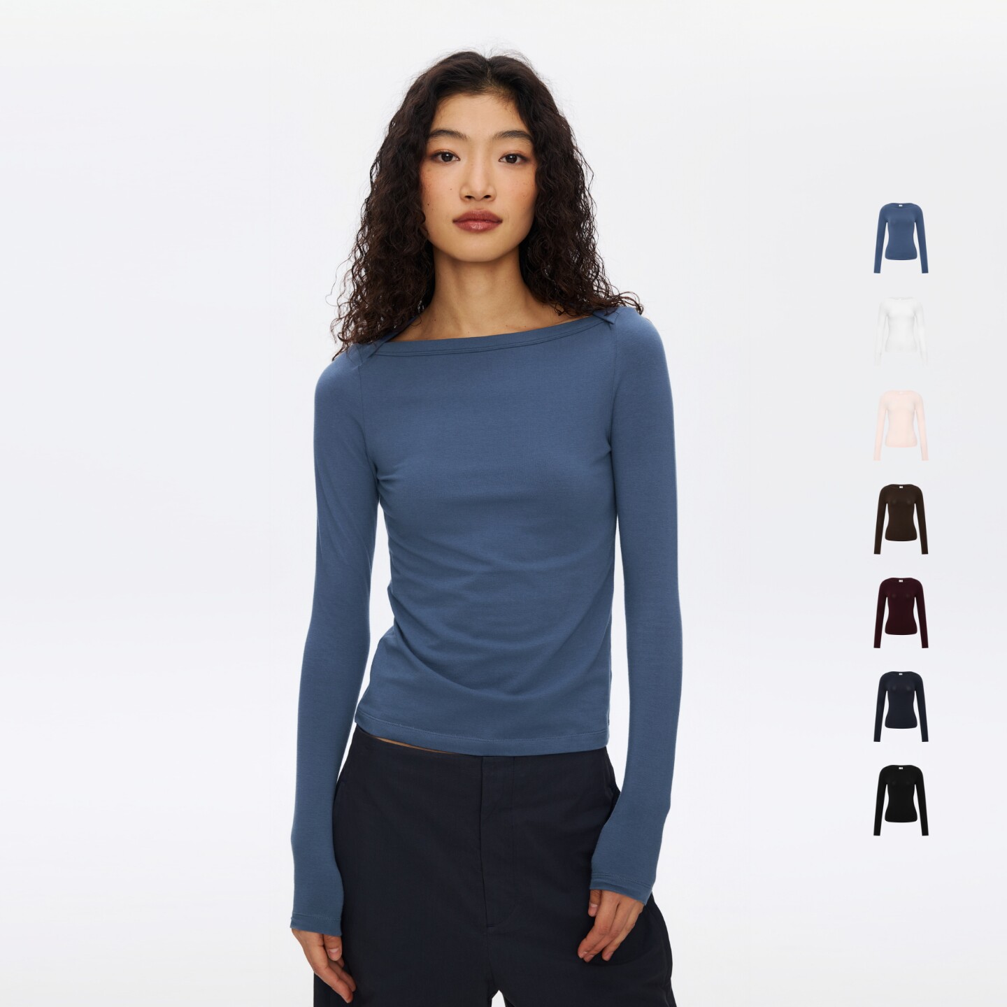 oneup简约修身船领白色长袖t恤女春季亲肤透气健身瑜伽运动上衣