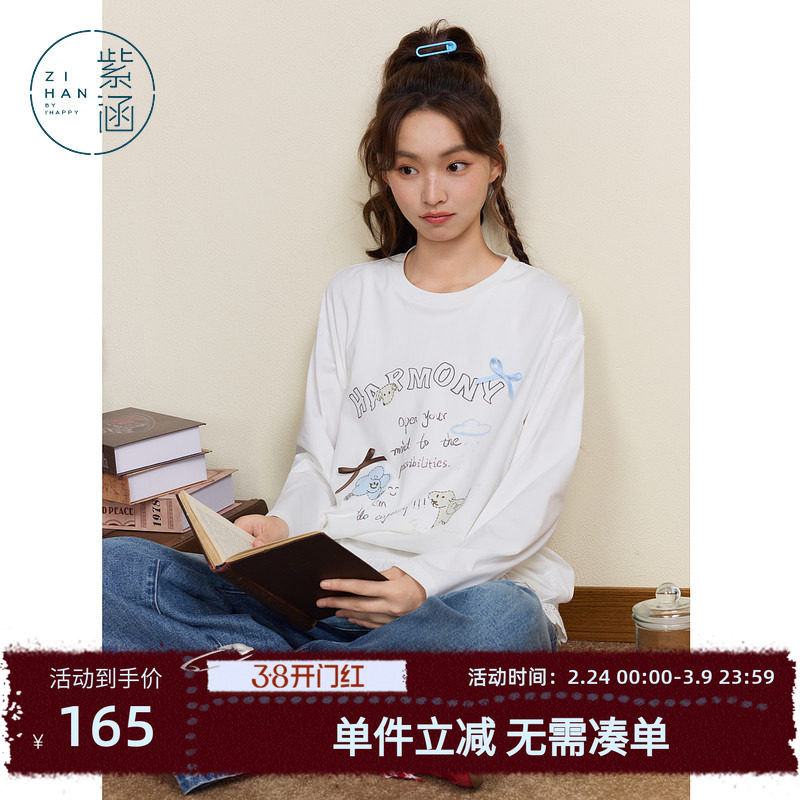 紫涵圆领白色长袖T恤女秋季新款可爱学院风童趣绣印宽松显瘦上衣