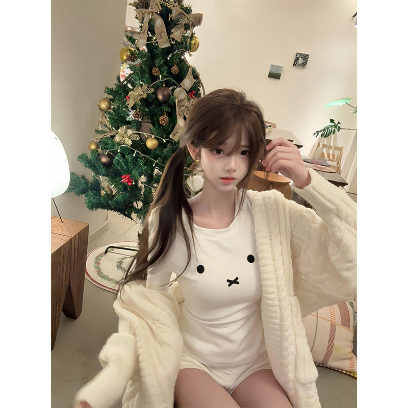 可爱米菲兔印花白色长袖t恤女秋冬修身收腰加绒保暖内搭打底上衣