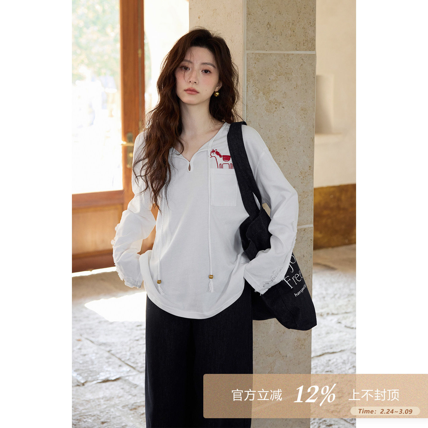 韩系刺绣白色长袖t恤女春秋2025新款慵懒宽松oversize打底衫上衣