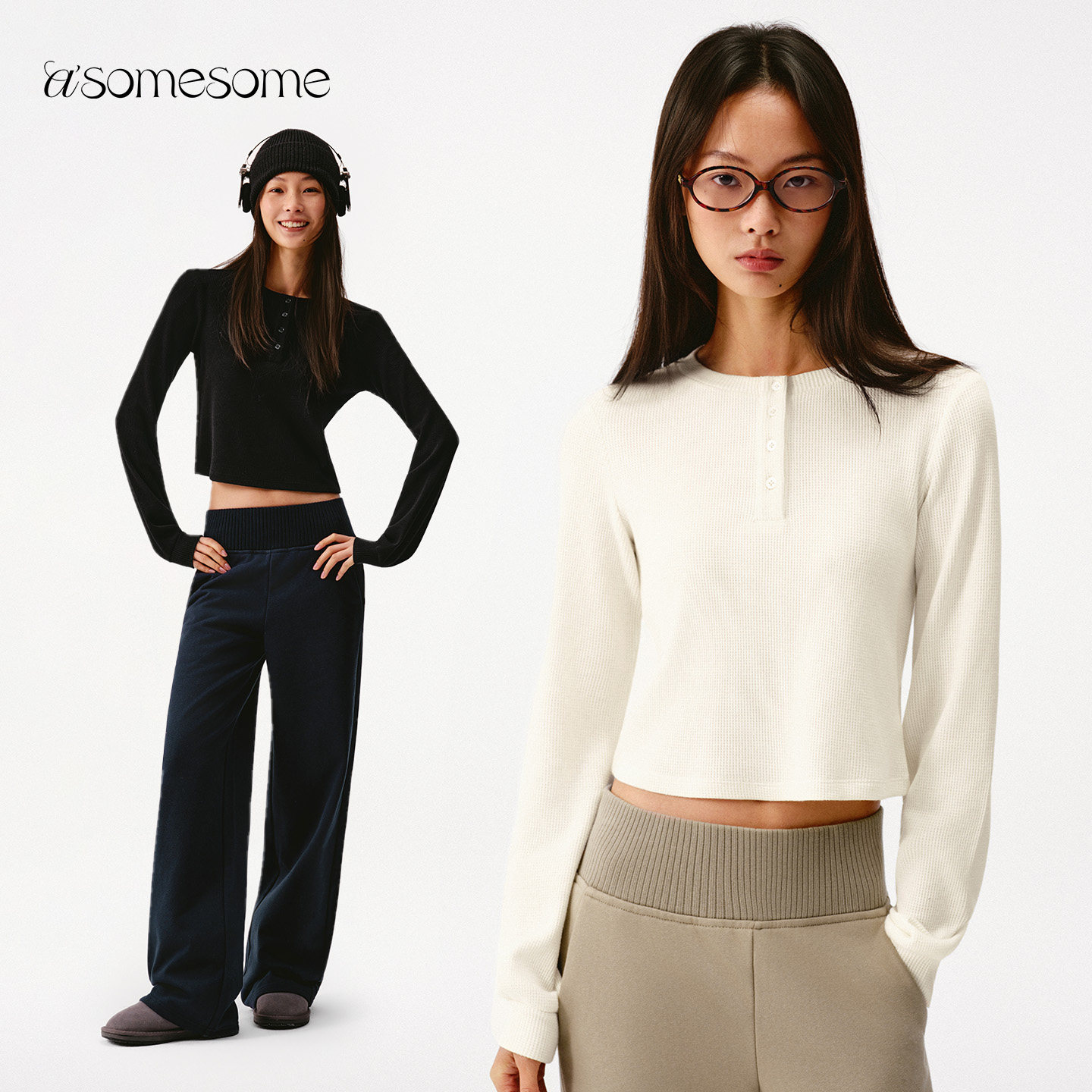 asomesome华夫格亨利领白色长袖T恤女春新宽松内搭打底短款上衣