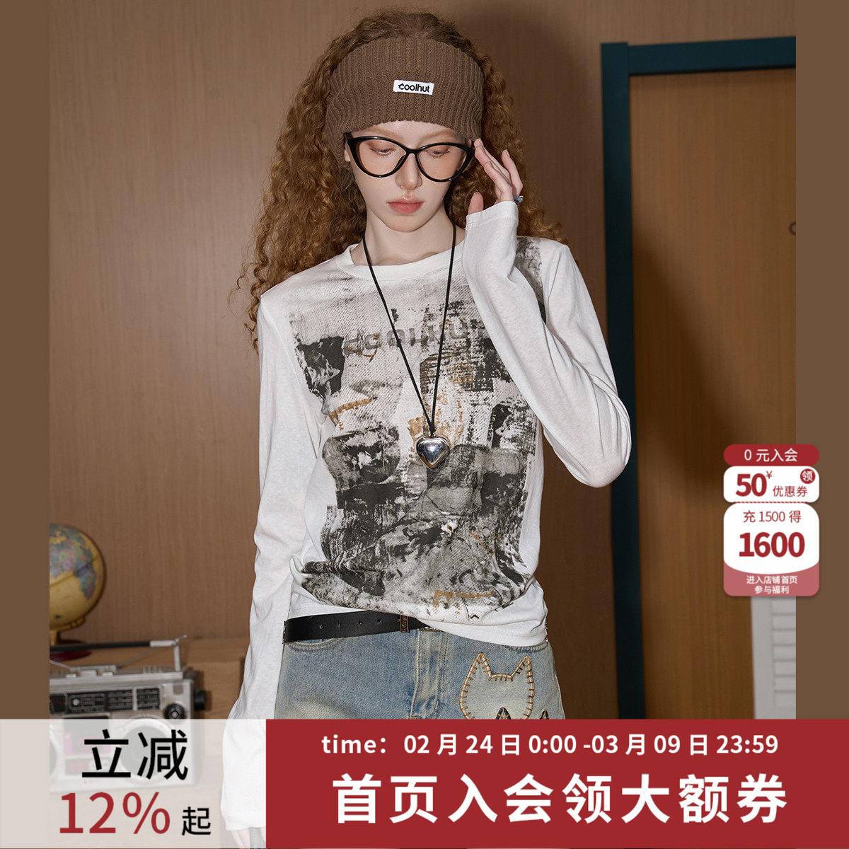 coolhut宽松休闲设计感印花上衣百搭2026春季白色长袖T恤女打底衫