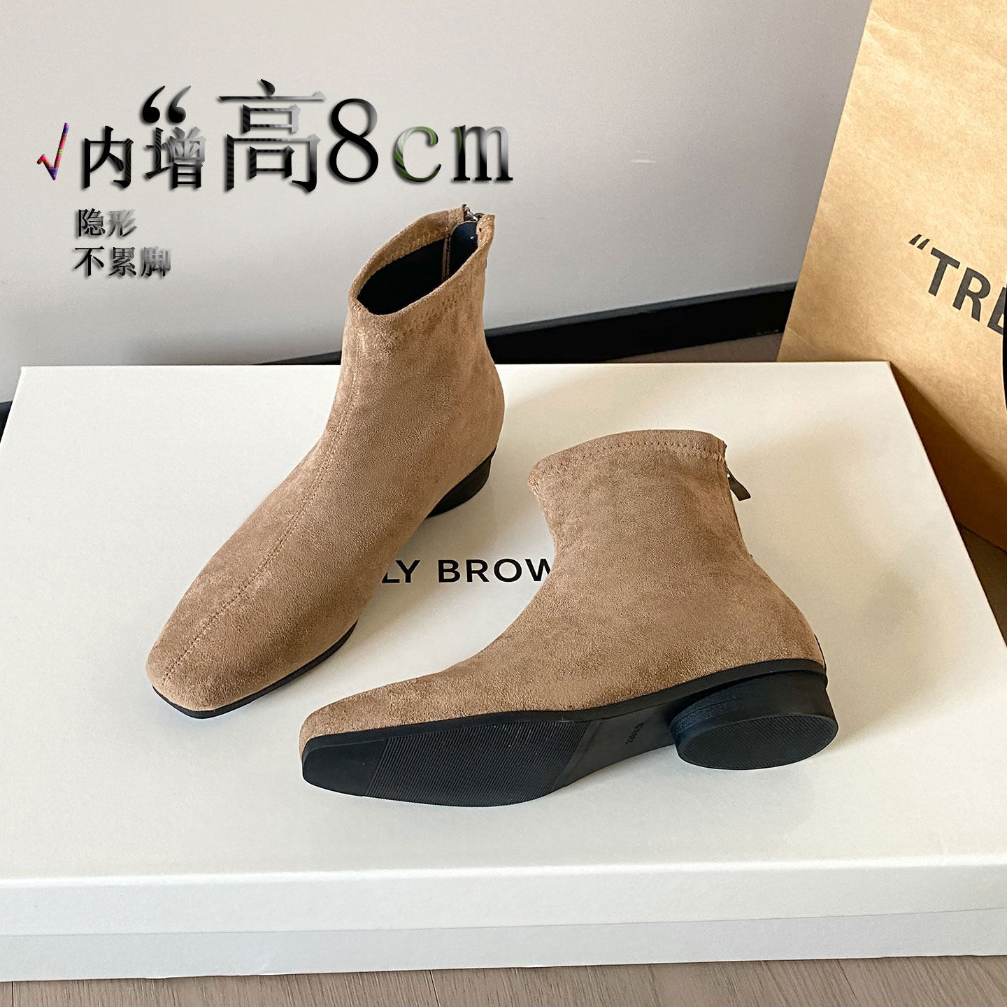 羊猄绒面~内增高8cm短靴女显瘦洋气小个子粗跟增高方头秋冬瘦瘦靴