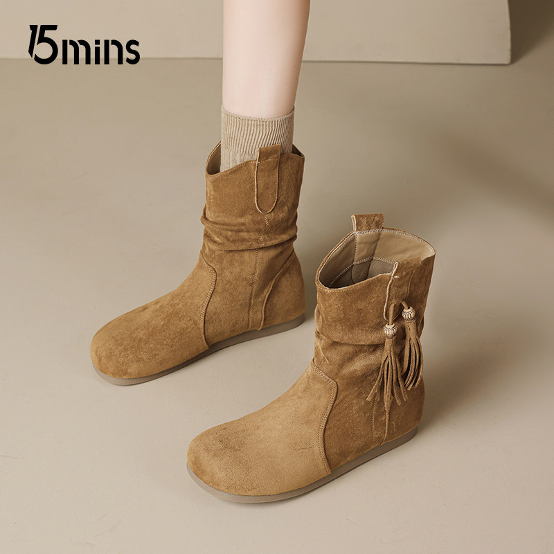 15mins流苏短靴女款2025新款复古褶皱堆堆靴美拉德勃肯西部牛仔靴