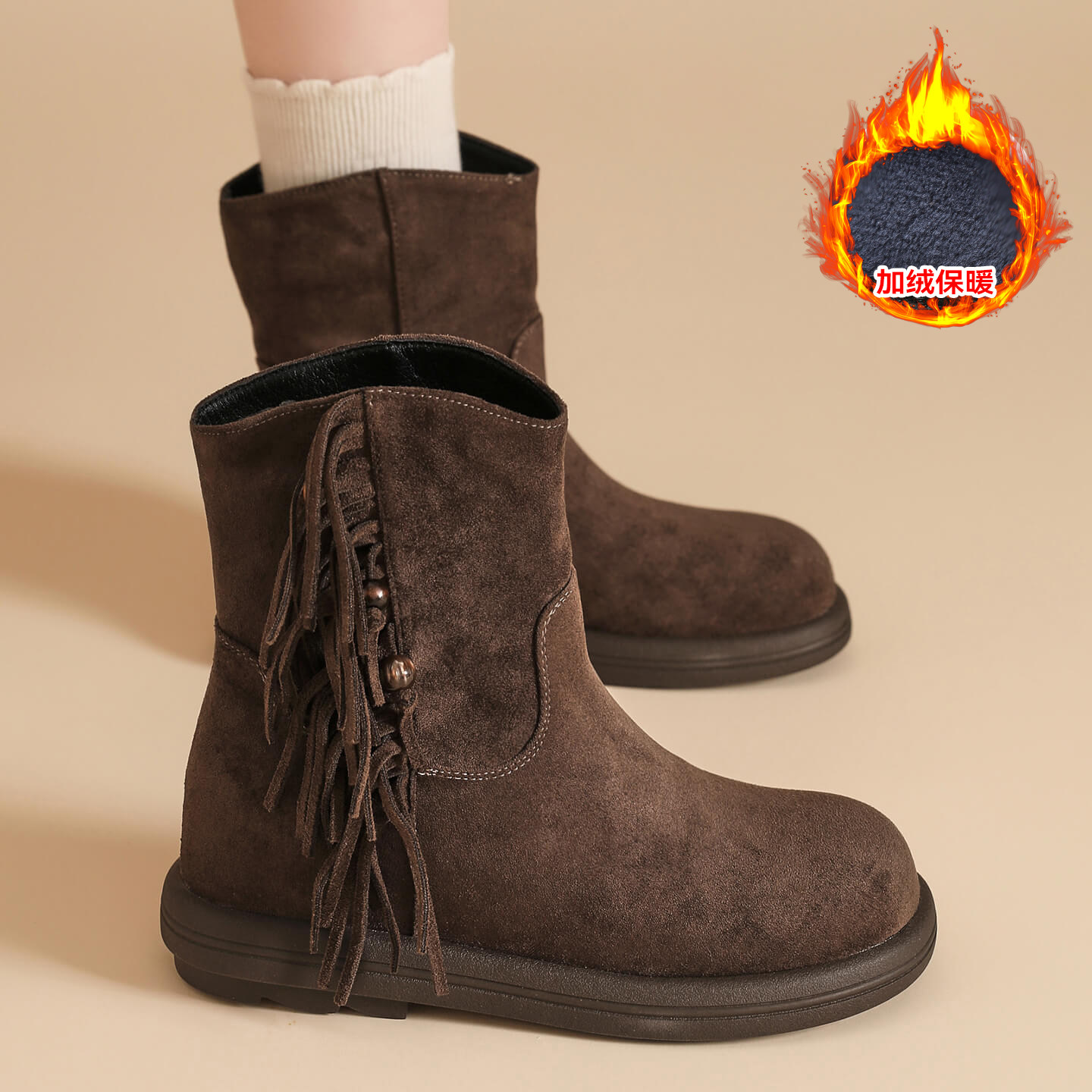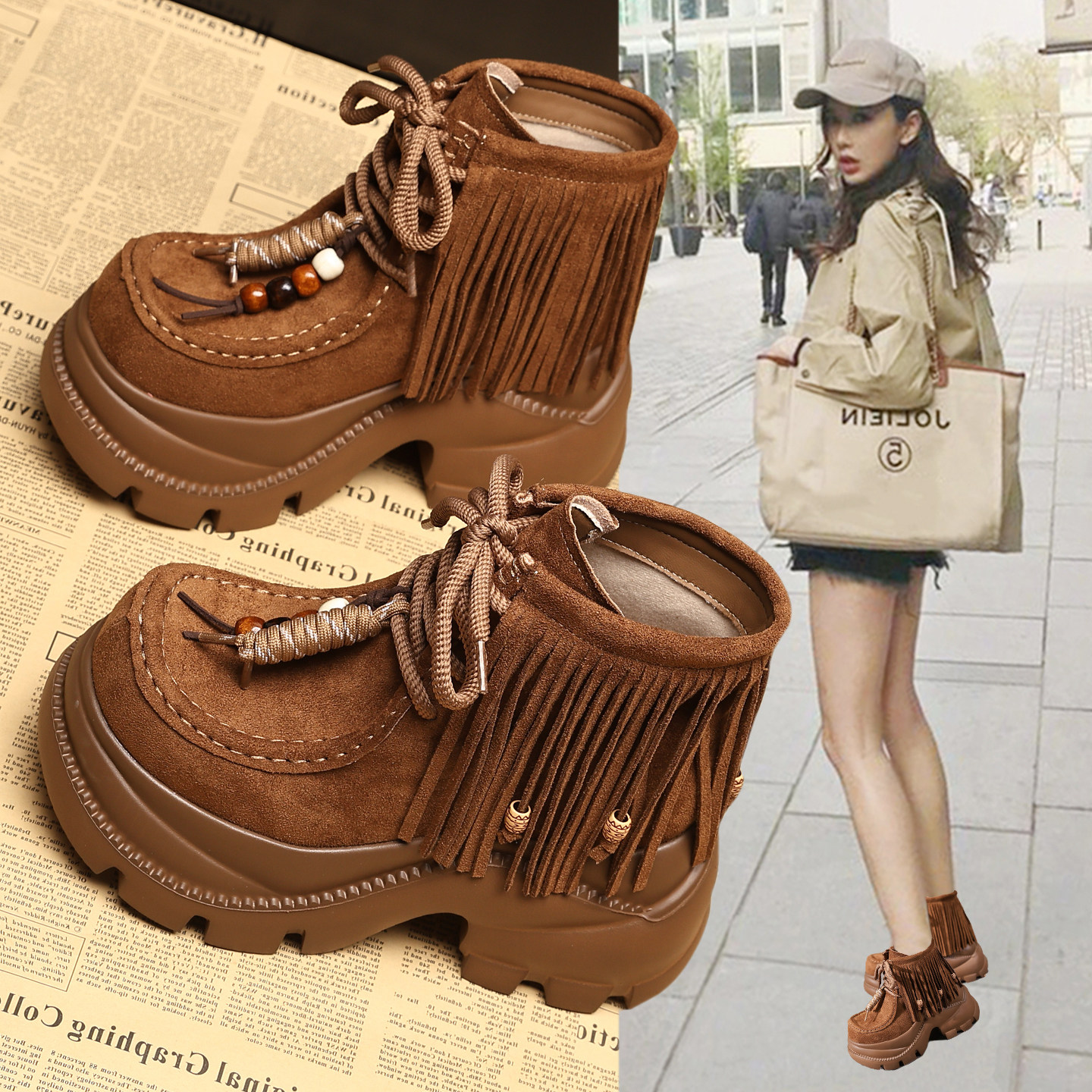 2025秋冬新款杏色美拉德风流苏靴子女短靴厚底增高旅行复古文艺靴