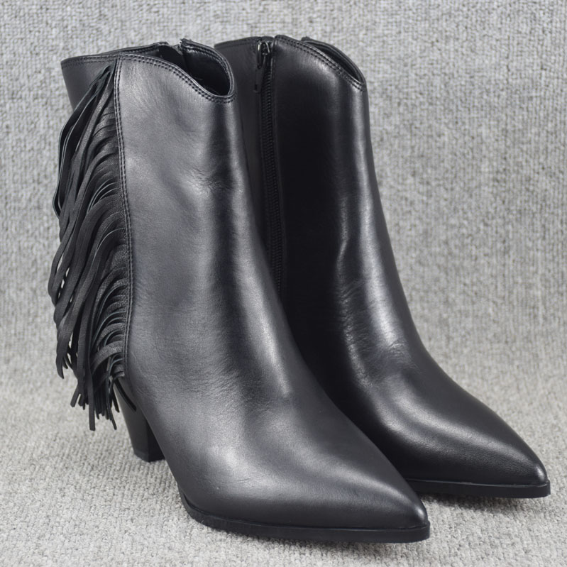 外贸原单大码真皮粗跟尖头流苏短靴子秋冬踝靴女鞋短筒马丁靴女鞋