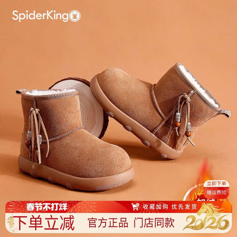 蜘蛛王女鞋2025冬季加绒保暖厚底雪地靴女休闲复古磨砂皮流苏短靴