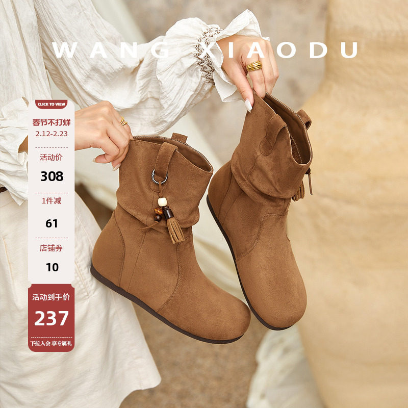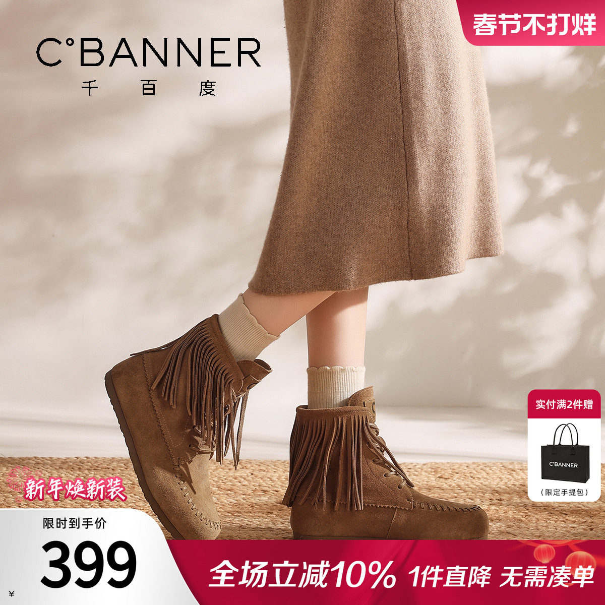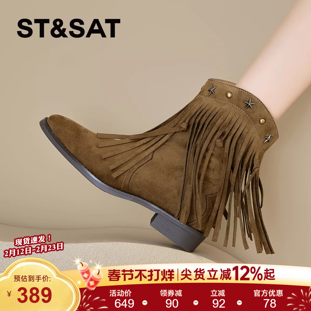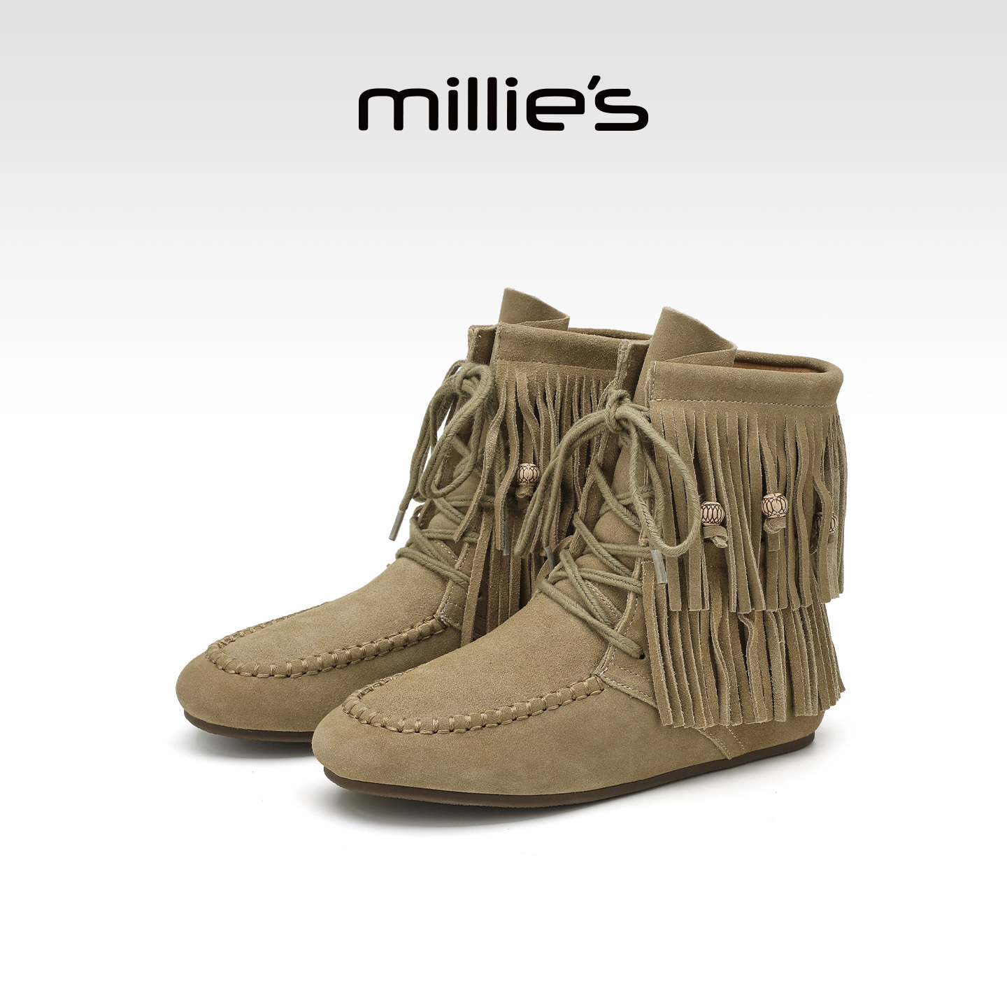 MILLIE'S/妙丽2026新款复古平底流苏短靴女百搭舒适内增高西部靴Q
