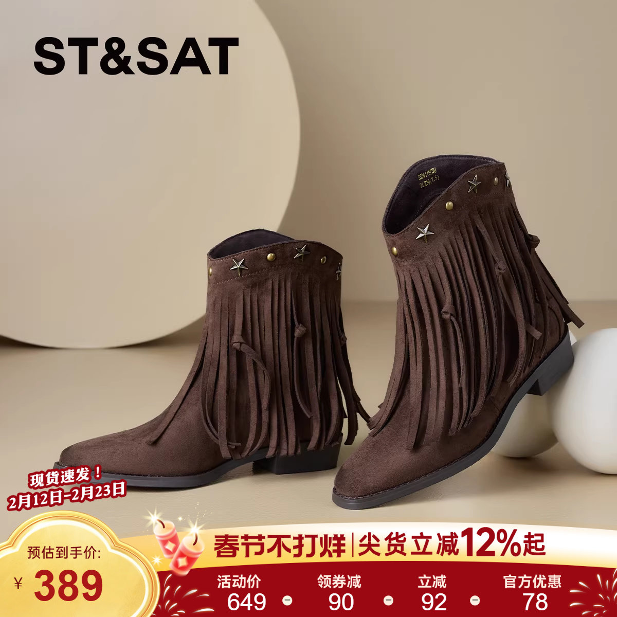 星期六2025秋季新款流苏短靴女款美拉德中筒瘦瘦马丁靴西部牛仔靴