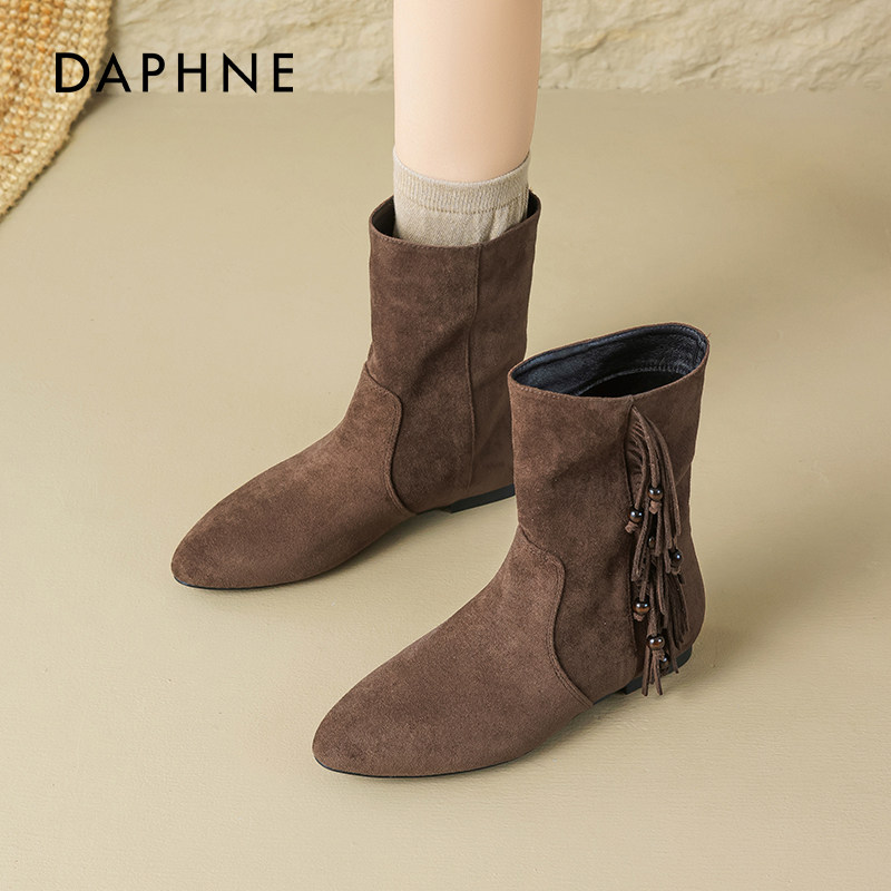达芙妮棕色靴子女2026新款秋冬加绒美拉德流苏马丁靴瘦瘦高跟短靴