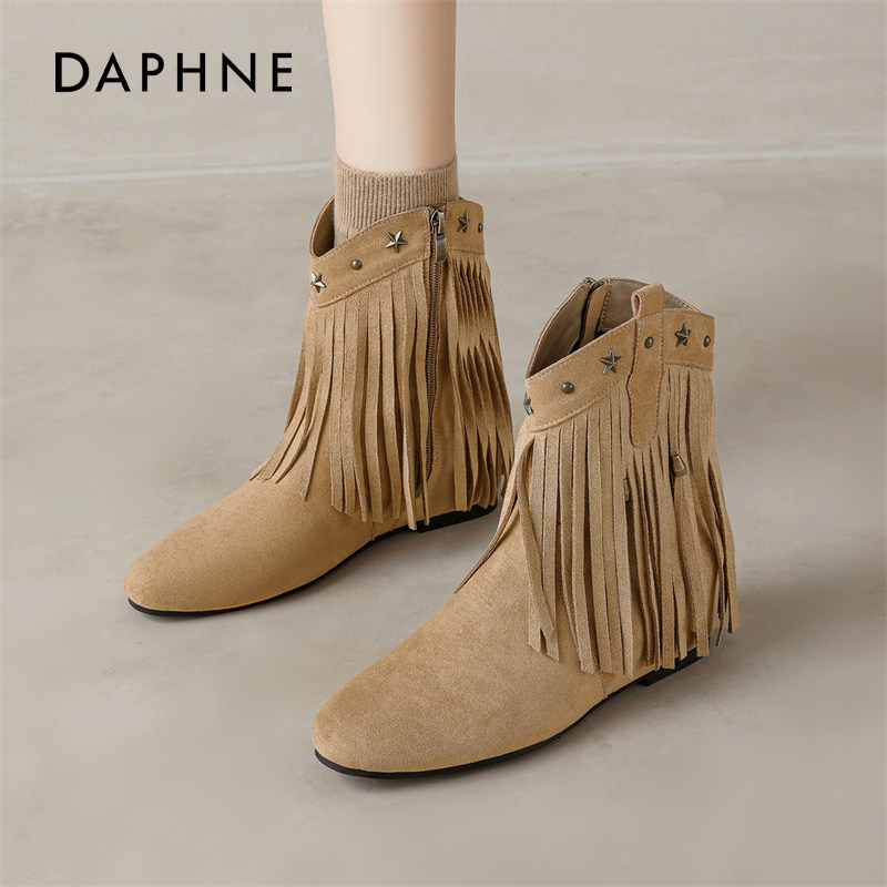 达芙妮流苏短靴女2026新款秋冬季美拉德靴子西部牛仔靴加绒马丁靴