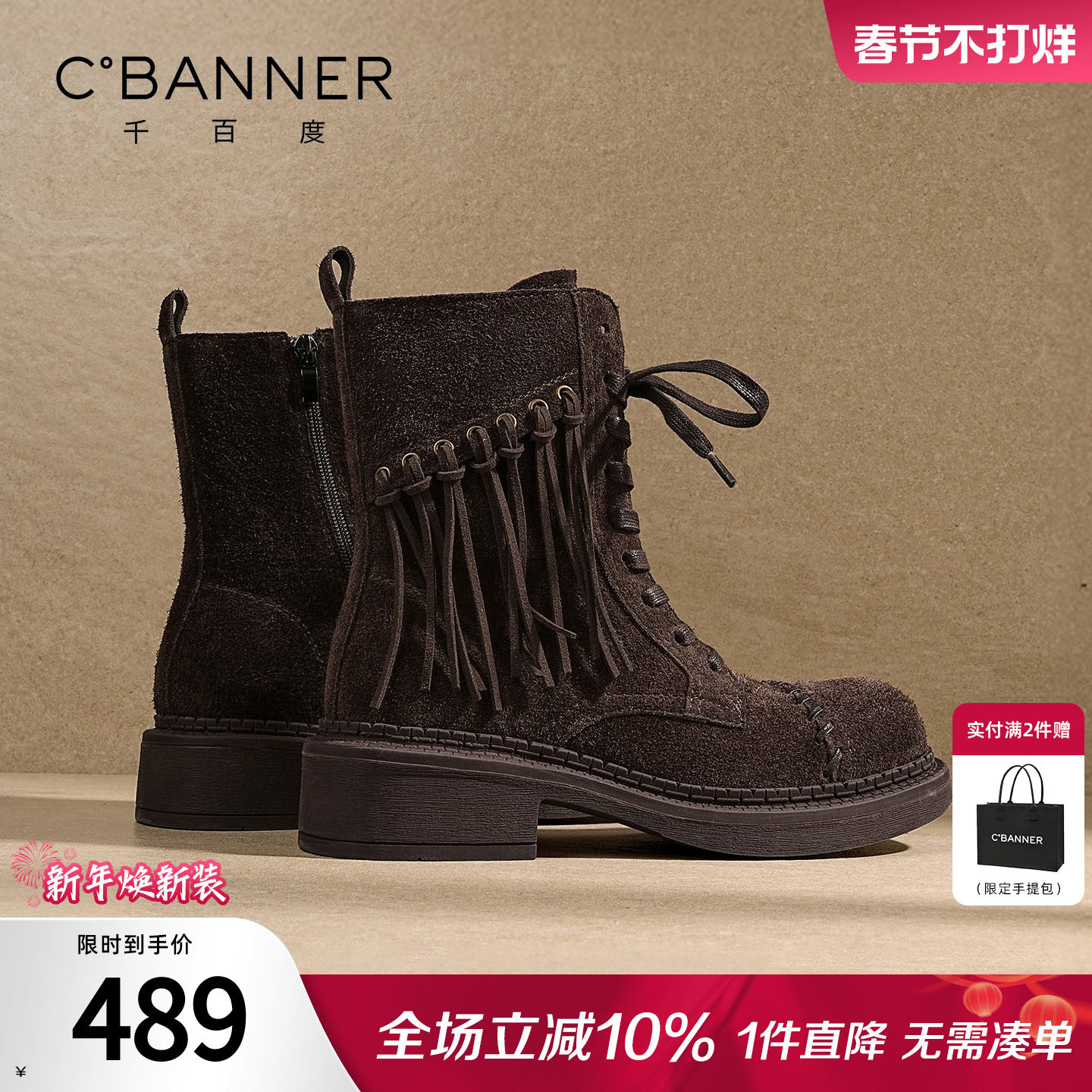 千百度复古流苏短靴女冬季2025新款时尚厚底马丁靴女百搭西部短靴