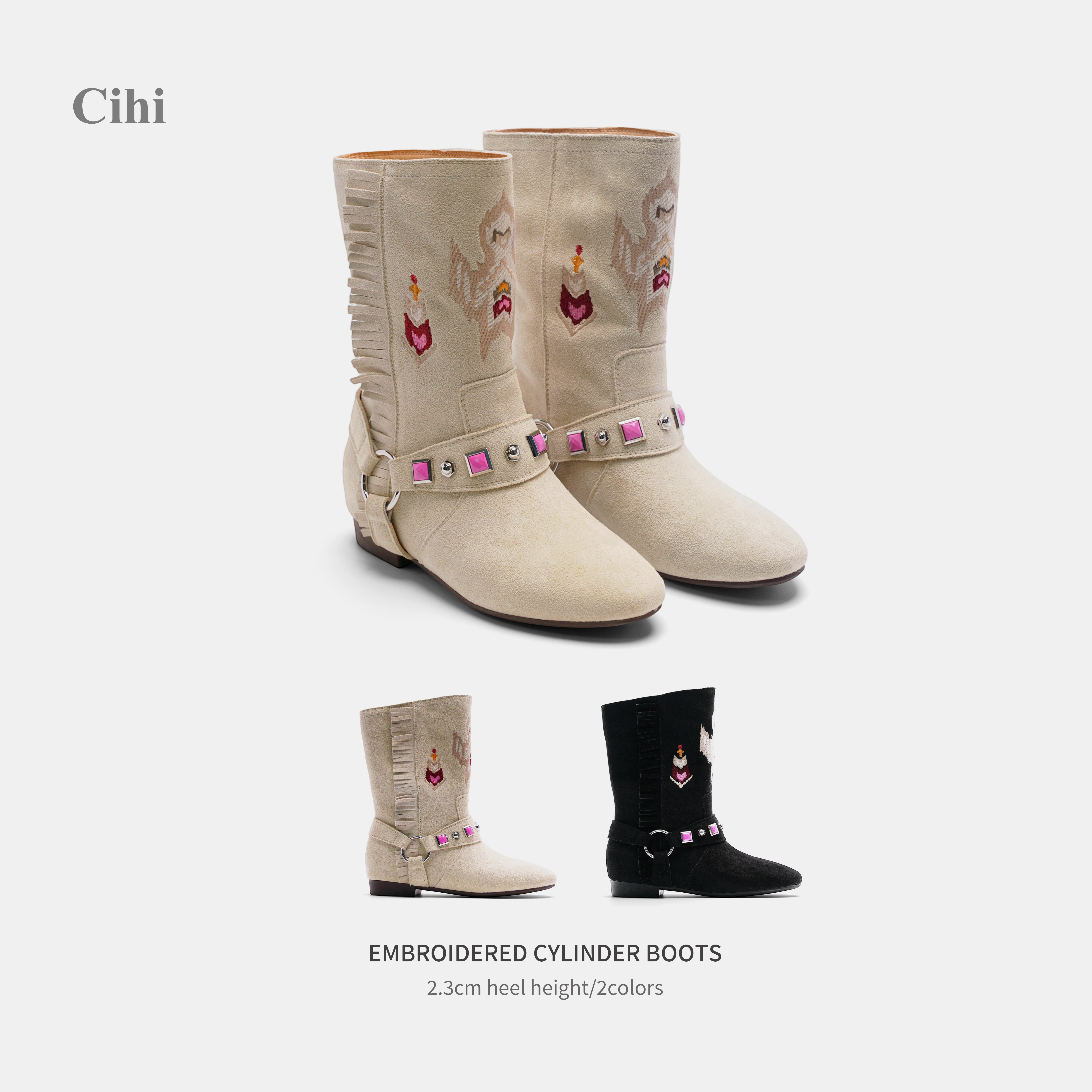 Cihi设计'Kismet' 复古刺绣流苏短靴波西米亚重工绒面西部骑士靴