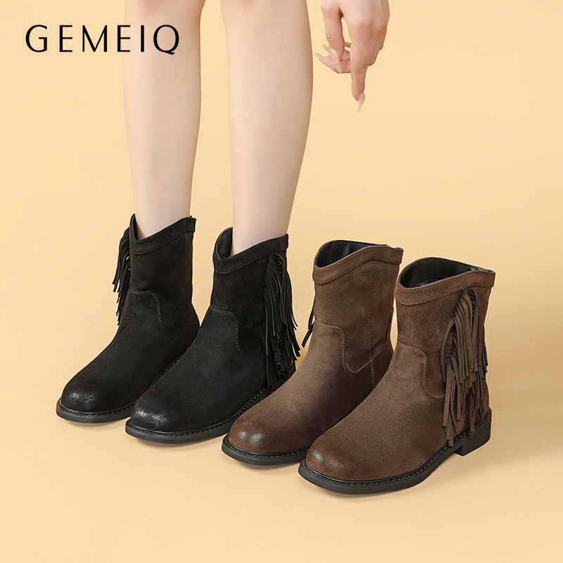 戈美其流苏短靴女秋冬新款复古西部牛仔靴时尚百搭潮流舒适女靴子