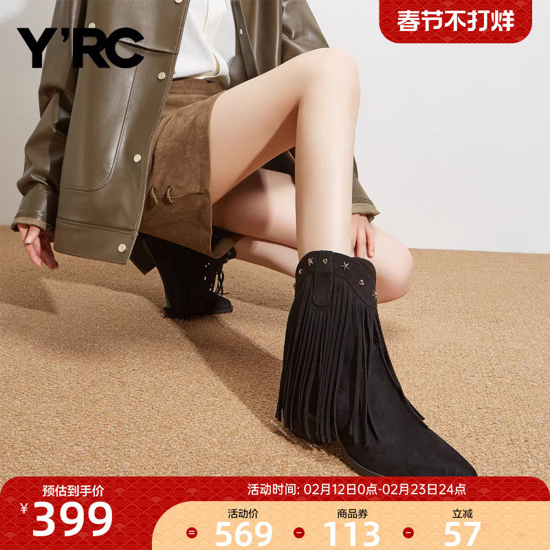 YRC尖头流苏短靴女初秋新款V口复古美拉德粗跟切尔西牛仔靴子